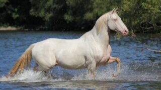 The “Champagne” gene dilutes both red and black pigment, creating colors like gold, amber, and classic champagne. These horses often have pinkish skin with freckles and light-colored eyes.